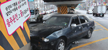 首尔市为迎接年末,正开展预防酒后驾驶的活动“酒后驾驶的结果一样”。直到明年1月,警方也会每周开展一次全国性的严加管束酒后驾驶的行动。图片是21日在首尔地铁5号线西大门站附近车道设置的事故车辆。