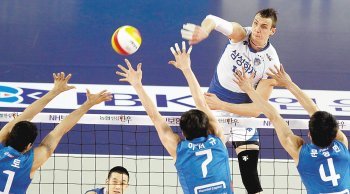 三星火灾队的加彬﹒修密特(右上)确实是个“怪物”。1日在天安柳宽顺体育馆与现代金融进行对抗赛的时候,他射进了两队的最高分36分,引导了3比1的胜利。