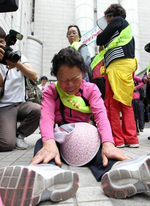 25日在首尔瑞草区瑞草洞首尔中央法院分院举行了釜山储蓄银行事件第一次公判。旁听后出来的一名受害者向银行律师团进行抗议示威的时候不禁坐下来痛哭。
