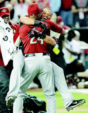 12日,美国职业棒球联盟本垒打棒球赛在美国Phoenix举行,获胜的罗宾逊•坎诺正与父亲侯赛因•坎诺(24号)正热烈拥抱。罗宾逊的父亲是一位无名投手,为给参加本垒打棒球赛的儿子助阵,他亲自商场投掷了棒球。