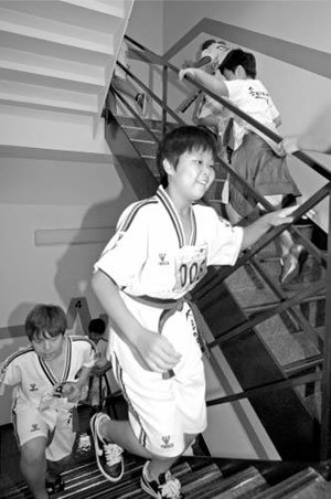 16日上午在首尔永登浦区汝矣岛洞63大厦举办的“第九届63爬楼梯比赛”的小朋友们正在爬楼梯。从1层到60层共有1251个阶梯。此次活动是韩国生命和韩华酒店&度假村、社会福祉共同募捐会共同筹备的社会贡献活动。