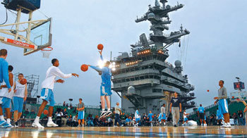 10日,美国北卡罗来纳州大学篮球队选手在美国加州圣迭戈北岛海军基地抛锚的卡尔文森号航空母舰甲板临时准备的篮球场练习。为了纪念“在乡军人”之日11日将在航空目前举办开幕战。曾经水葬本拉登尸体时候用过原子力航空母舰卡尔文森号。