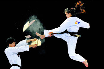 “像蝴蝶一样起身,像蜜蜂一样冲!”4日,在英国伦敦爱塞尔中心举行2012年伦敦奥运会测试,世界跆拳道联盟示范团的一位女选手展示了帅气空中踢腿。