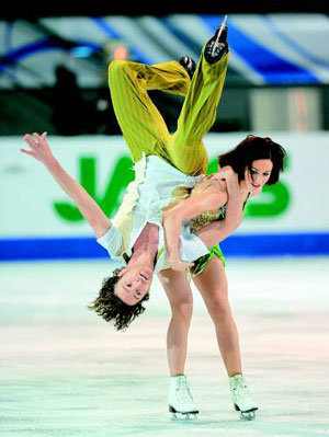 9日,在加拿大魁北克开幕的花样滑冰大奖赛总决赛前夕,法国冰舞球队纳塔利佩印色拉(右)和帕比昂在进行实战训练。时隔3年获得大奖赛总决赛参赛资格的日本浅田真央得知母亲病危的消息后,放弃了比赛。