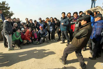 28日,韩国总统李明博与青瓦台职员在北岳山的顶峰合影留念。其他职员将总统照相的瞬间用自己的手机拍摄下来。