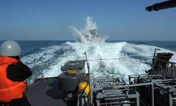 “天安”舰事件两周年纪念日在即,21日在西海实施的战斗态势演习中,1200吨级哨戒舰向模拟敌人的潜艇发射暴雷且击中目标,进而出现一个巨大的水柱。