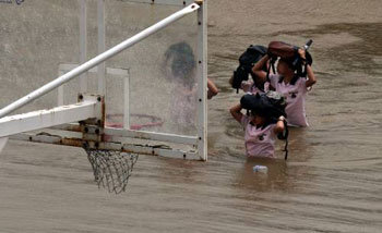 因为第14号台风“天秤”的影响出现集中降雨的30日下午,在全南木浦市上洞综合车站附近公园学生们正在头顶着书包走过篮球场。天秤在湖南地区引发了很多降雨,降雨量各是全南珍岛郡235.5mm、木浦市172.9mm、全北正邑市205.0mm等。