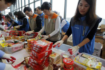 17日下午在首尔永登埔区汝矣岛洞友利投资证券,“世界未来”宣传大事朴娜林播音员(右2)和“世界未来”会长梁昊升(右3)、友利投资证券社长黄成昊等友利投资证券70多名员工正在制做要传达给约2300名贫困邻居的中秋礼品套装。
