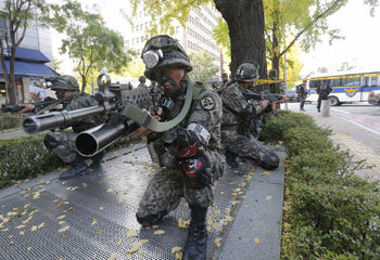 国军首都防卫司令部29日下午与警察厅、消防防灾厅一起进行了对首尔汝矣岛内国家主要设施的防御训练。当天用重武器武装的士兵们假设恐怖分子占据国家主要设施的情况,进行了镇压作战。