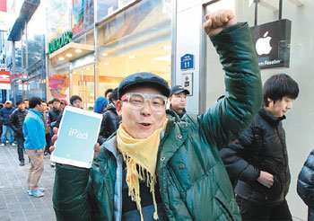 2日首尔中区明洞卖场前,一名顾客从前天下午9点开始排队,第一个买到“iPad mini”。“iPad mini”尺寸为7.9英寸,比现有的iPad(9.7英寸)还小。