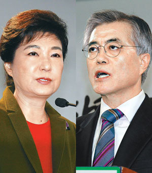新世界党候选人朴槿惠(左)和民主统合党候选人文在寅25日各在中央选举管理委员会上进行了第18代总统选举候选人登记,随之正式性的双方对决构造拉开了帷幕。图为两位候选人各在党社举行记者会,约定胜利的形象。