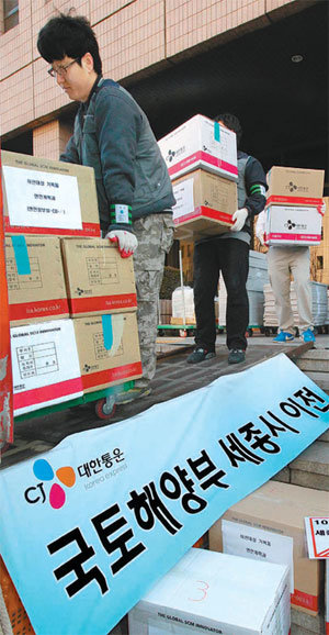 国土海洋部在开始世宗市搬迁的26日上午,物流公司的职员们正在搬迁果川政府大楼的物品。继果川政府大楼入住部门中第一个搬迁部门—国土海洋部之后,计划财政部、环境部、农林水产部、公正交易委员会等都将搬迁到世宗市。
