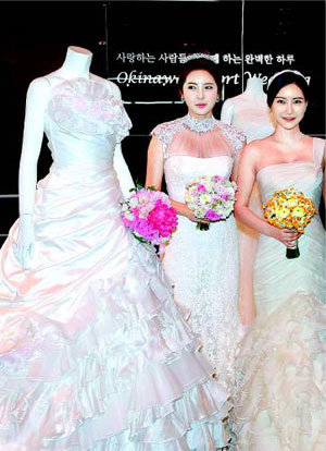 27日上午在首尔广镇区广场洞华克希酒店举行的“第16届情人结婚博览会”上,模特们正在展示2013年新款限量版婚纱。