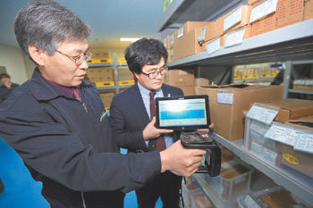 韩国水力原子能14日在全南荣光郡弘农邑荣光院子能发电所召开了防止供货非法行为的“原子能部件追踪管理系统”构建说明会。韩国水力原子能的有关人士们正在通过手机读卡器确认仓库部件的系列号码等信息。