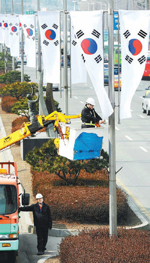 在3·1节前一天(2月28日),首尔松坡区职员们正在首尔松坡区奥林匹克路中央分离台升国旗。目前,松坡区主要干线道路边已挂上了3600多面太极旗。