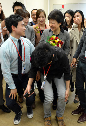 朴槿惠总统12日访问了位于首尔瑞草区瑞草洞的信息技术(IT)风险投资公司傲科视讯公司(Alticast),并与其职员们拍照留念。在拍照过程中,其中一职员为了配合照片顺利拍摄,故意弯曲膝盖降低身高,灿烂的笑着。