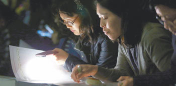 7日下午在首尔松坡区蚕室洞蚕室学生体育馆召开的成均馆大学入学说明会,聚集了6000多名家长和学生。因为1层客厅已经坐满,只好坐在没有灯光的2楼的一名家长正在用手机照明查看入学说明。