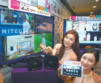 LG UPLUS于28日展示了可以在大型TV画面中同时观看四个频道的服务。模特们正在演示将各自不同的4个体育频道显示在一个TV画面之中。