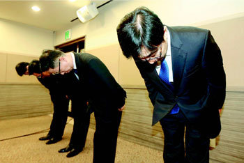 运营便利店CU的BGF零售公司社长朴在九(右)等高层职员30日在首尔大峙洞纤维中心对于最近因为与总店发生矛盾而自杀的加盟店主金某的事件,发表了对国民道歉文后低头表示了歉意。朴社长还承认在金某自杀后伪造死亡诊断书,发放给媒体。CU方面当天还提出了对策,表示会运营由本社和店主、外部专家组成的“自由纷争解决中心”和解决店主福利问题的“相生协力室”、运用140亿韩元规模的“加盟店主相生协力基金”等。