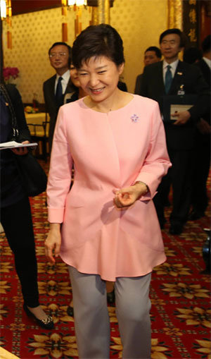 朴总统访华时选择了比以往更加舒适,亮色系列的夹克,以展现了其自信。从左到右依次为女性化的新设计粉红色夹克,亮色较高令人舒适的黄色夹克,令人想起太极旗黑色乾坤图样的白色夹克,高档紫色夹克。