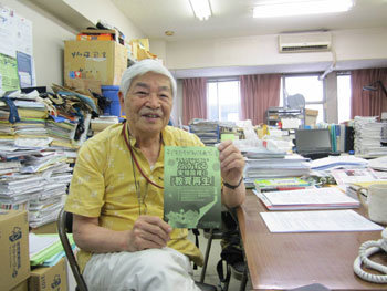 日本事务局长手里拿着价值50日元的“怎么办,安倍政权的‘教育再生’”宣传册向人们展示。他表示“日本教科书中最危险的表现是以天皇(日王)的名义美化死亡”,批判道“安倍晋三总理更换教科书的目的就是要把日本改变成可以进行战争的国家”。