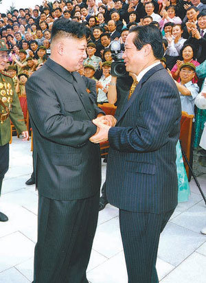 朝鲜劳动党第一书记金正恩(中间)上个月30日在平壤与海外同胞们集体合影之前正在与和平汽车社长朴向权握手。左侧的劳动党对韩负责秘书兼统一战线部长的金养建表示,金正恩称“未来也要为了祖国的统一携手同行”。