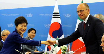 朴槿惠总统5日(当地时间)在俄罗斯圣彼得堡昆斯塔尼洛夫斯基宫与意大利总理恩里科.莱塔(右侧)在20国集团(G20)第一次双方首脑会谈之前握手。就任后第一次出席多国外交的朴总统以韩国-意大利首脑会议为开端开始了20国集团首脑会议的日程。