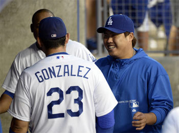 10日美国职业棒球LA道奇队球员的柳贤镇在道奇体育馆举行的与阿里索那的比赛开始之前坐在等候席上露出了灿烂的微笑。柳贤镇12日将在阿里索那之战中上场,与左腕投手Patrick Corbin展开对决。