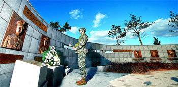 20日来自延坪岛的海军陆战队一等兵李成元访问了仁川翁镇郡和平公园,正在给海冰路军队所属的已故徐正宇下士和文光旭一等兵的浮雕雕像焚香。