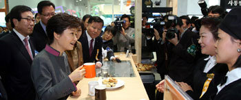 朴槿惠总统27日在釜山海云台区BEXCO召开的“2013大韩民国地区希望博览会”,与给自己冲咖啡的多文化家庭人士进行了对话。