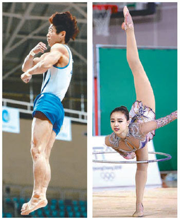使出浑身解数,正在进行跳马表演的梁鹤善(左)和表演华丽圈操的孙妍在。“跳马之神”梁鹤善和“艺术体操精灵”孙妍在将一同参展明年4月举行的第2届韩国杯国际体操大赛。