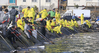 在春节(上个月31日)期间发生油轮输油管漏油事故的全南丽水市申德村海岸,警察、公务员、军人、志愿者等2日聚集在一起用吸油布和捞网进行了清理工作。