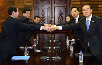 历经4年终于促成南北离散家属相逢活动。将于本月20日至25日在金刚山会面。为了商讨离散家属相逢活动,南北红十字实务接触代表团韩方首席代表、韩国红十字会执行委员李德行(右二)和朝方首席代表、朝鲜红十字会中央委员朴永一 (左二)等代表团成员见面后正在握手。统一部提供