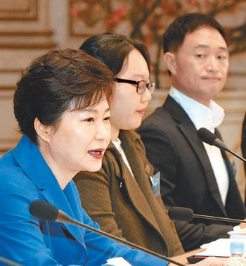 朴槿惠总统于17日在青瓦台迎宾馆举行的创造经济领域业务报告中进行了发言。最近支援MBC新总经理征募的金荣希导演也参加了报告。