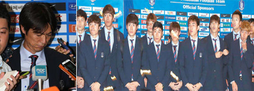 韩国国家队主帅洪明甫(左图)于30日乘飞机到达仁川国际机场,低头倾听记者们的提问。一名网络论坛成员组成的会员向国家队投掷了南瓜麦芽糖(韩国语,吃麦芽糖,具有吃苦头,(你)还不如上吊去的意思),使得洪帅和其他选手们惊慌失措。