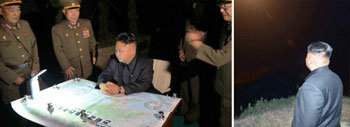 북한 노동신문은 김정은 노동당 제1비서가 전략군 로켓 발사훈련을 지도하는 사진(왼쪽 사진)과 함께 단거리 탄도미사일 발사를 지켜보는 모습을 27일자에 공개했다. 26일 실시된 탄도미사일 발사는 이른바 전승절(정전협정체결일)을 맞아 이뤄진 것으로 김 제1비서는 주한미군을 겨냥한 것이라고 밝혔다. 사진 출처 노동신문