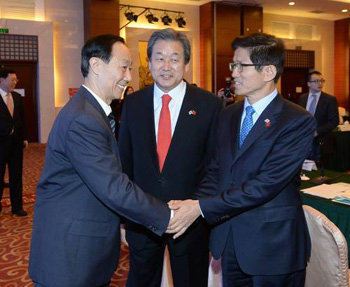 正在访问中国的新世界代表金武星(中)与保守革新委员长(右)金文秀14日在北京的某酒店与中国共产党对外联络部长见面,正在握手。