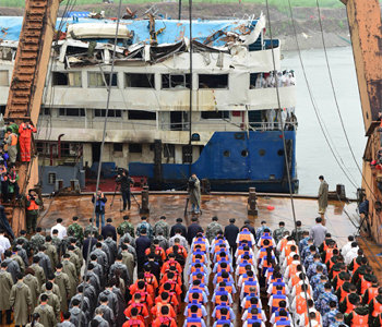 中国军队和交通部等在生存可能时间(黄金时段)即72小时过去后,从4日晚起实际上进入了船体打捞工作,并从第二天上午7点开始,进行了船体扶正工作。在中国官方媒体中央电视台电视直播的情况下,2艘5000吨级起重船和1艘160吨级起重船开始翻转并提起船体,2小时50分钟后4层结构的游船浮出了水面。政府当局为了阻止遗体及遗物流失,在长江下游200米处设置了阻拦网。