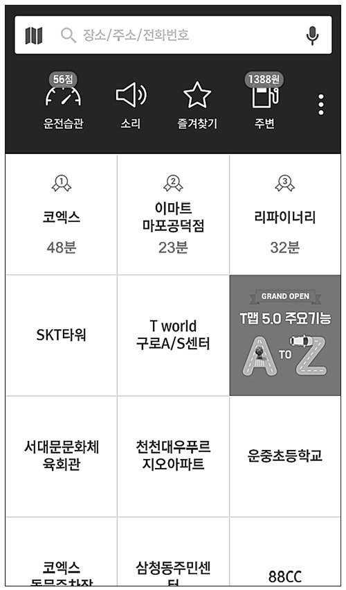 韩国排名第一的智能手机导航软件T地图,会回答诸如“一会儿四点钟左右出发的话,去婚礼场会不会迟到?”之类的问题。T地图拥有“何时出发”的功能,只要把出发时间和目的地输进去,就会根据以往收集的交通信息数据,告诉你预计所需时间。它可以用来预定春节、中秋等节日回家的时间表和去仁川机场和婚礼场的出发时间。