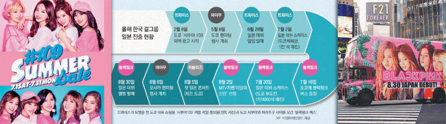 在TWICE占领涩谷的情况下,上月中旬,女子组合BLACKPINK(YG娱乐)开始了来往于东京原宿和涩谷之间的公交车身包装广告。BLACKPINK4名成员的面孔频繁出现在东京各繁华街道。上月20日举行的首个Show Case的参加应征者达到了20万名。拥有1.4万个坐席的演出场馆“武道馆”挤满了当地的BLACKPINK粉丝。同时出席的还有著名制作人梁铉锡。BLACKPINK将于本月30日发行收集在韩国发表的歌曲并整理成两国语言版本的日本出道专辑。