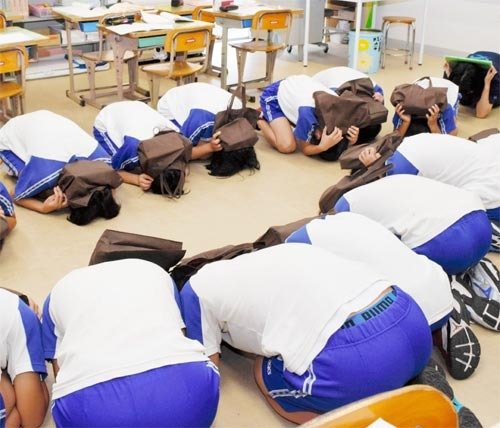 学生们集中到教室中间,用放有厚重书籍的书包顶在各自头上,一起踡坐在地上。当天的演练,是在假设导弹袭击导致玻璃窗碎片纷飞的情况下实施的。