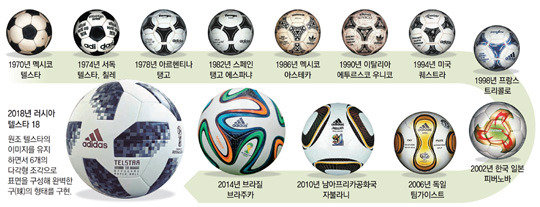 10日,国际足联(FIFA)和体育用品企业阿迪达斯公开的“Telstar18”的设计灵感来自最早的世界杯官方用球“Telstar”(1970年墨西哥世界杯)。由32块球皮组成的原祖Telstar为了很好地在黑白电视上显示出来,12块球皮制作成了黑色。Telstar的名字中包含着“电视之星”的意思。