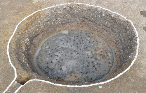在环绕南门的垓子外发现的陷阱,是一个直径3.5 ~ 4.9米、深度2.5米左右的圆圆的坑。64个陷阱布置在距离垓子6 ~ 8米远的地方,并排成2 ~ 4列。