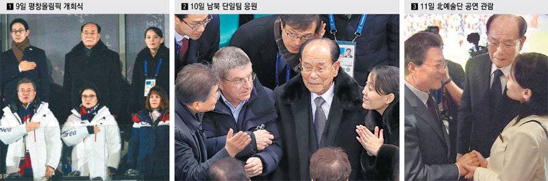但是在第二天青瓦台的午餐会之后,当天傍晚前往为南北韩女子冰球队加油时,情况发生了变化。文在寅、国际奥委会主席托马斯·巴赫、金永南和金与正并列坐在同一排上。虽然中间隔着巴赫这一“中间隔离带”,但人们多次发现,文在寅在与金永南和金与正对话。而在北韩代表团在韩国的最后一场活动、11日晚上的三池渊管弦乐团在首尔国立剧场的演出中,文在寅和金与正已经并列坐在一起。