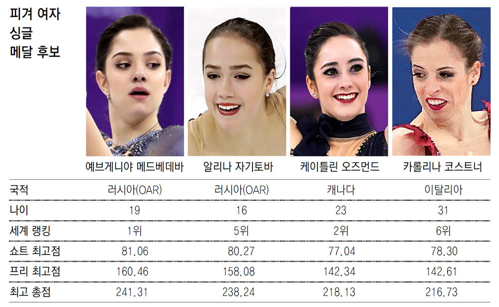 最接近金牌的候选人是以“来自俄罗斯的奥林匹克选手(OAR)”身份参赛的叶甫根尼娅•梅德韦杰娃和阿莉娜•扎吉托娃。两名选手的优点是,可以在没有失误的情况下完成各种三周跳动作,有利于取得高分。两人将在短节目和自由滑比赛中合计尝试7个三周跳动作。大韩冰上竞技联盟相关人士表示:“梅德韦杰娃和扎吉托娃在进行跳跃后,在空中的旋转力非常出色。因此,三周跳的成功率很高。”以三周跳的能力为基础,梅德韦杰娃在历届总得分排名中占据第1位(241.31分),扎吉托娃位列第2位(238.24分)。