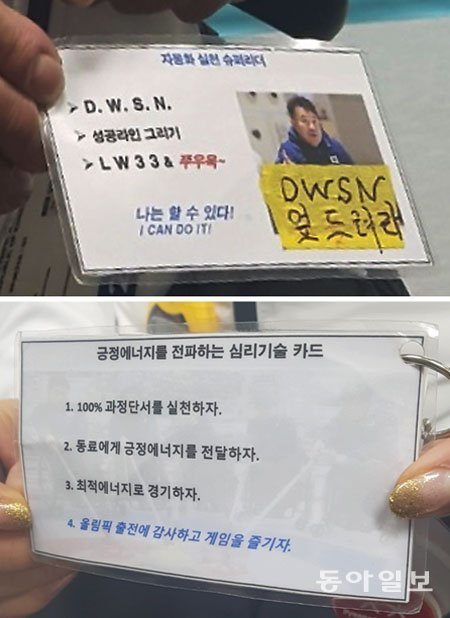 郑胜元的卡片正面写有“D.W.S.N”“L W 3 3 & 不要急”的字样。郑胜元表示:“D是趴下(Down)、W是调整力量(Weight)、投球距离短(Short)是不行的(Not)的意思。在重要的投壶之前,要把压低姿势,提高投壶的稳定性,只有很好地调整力量,才能使投出去的石壶最大程度地接近大本营中央。”他笑着说“另外一个句子的意思是‘按照主将的指示调整投壶路线(Line),调整力量(Weight)。而且,心中一定要默数到数字3后才投出石壶’。我的性格很急,所以一定要先数完数字后,再把石壶投进去。”