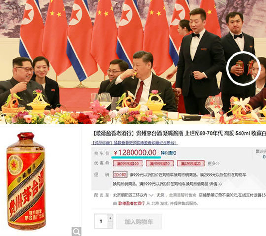 据北韩《劳动新闻》刊登的照片,在中国国家主席习近平上个月26日招待金正恩的晚宴上,两名中方服务员每人手里拿着一瓶茅台酒。网民们放大这张照片,发现是20世纪60~80年代生产的限定版茅台酒“矮嘴酱瓶”茅台。该酒为黄褐色的独特酒瓶,540毫升装的一瓶在中国网店里售价128万元人民币(约21715万韩元)。相当于一小盏的量也要约320万韩元。