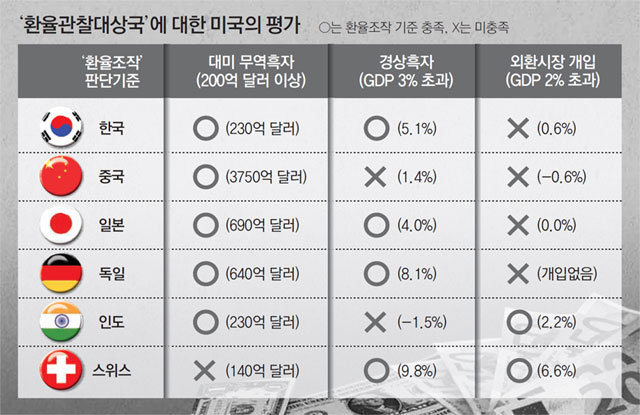 美国财政部14日(韩国时间)公布了“贸易对象国的汇率政策报告”,并将韩国、中国、日本、德国、瑞士、印度等6个国家指定为“观察对象国”。韩国的对美贸易顺差为230亿美元,且经常收支顺差达到国内生产总值(GDP)的5.1%,在汇率操纵国的3项判断标准中满足了2项,从而被指定为观察对象国。虽然躲过了被指定为最糟糕的情况汇率操纵国,但美国要求韩国详细公开外汇市场的介入现状。韩国政府一位高层官员表示:“美国已经详细了解韩国外汇当局在特定时期购买的美元数量,并要求公开收购量和抛售量等交易相关统计。”韩国政府担心,如果一一公开买进和抛售的明细,而不是在一定期间的美元交易结果净买入(买进额-抛售额)规模,那么外汇政策的效果将会大幅下降。企划财政部表示,“很难接受美方的所有要求,考虑到各国的事例,会选择符合我们状况的方法。”
