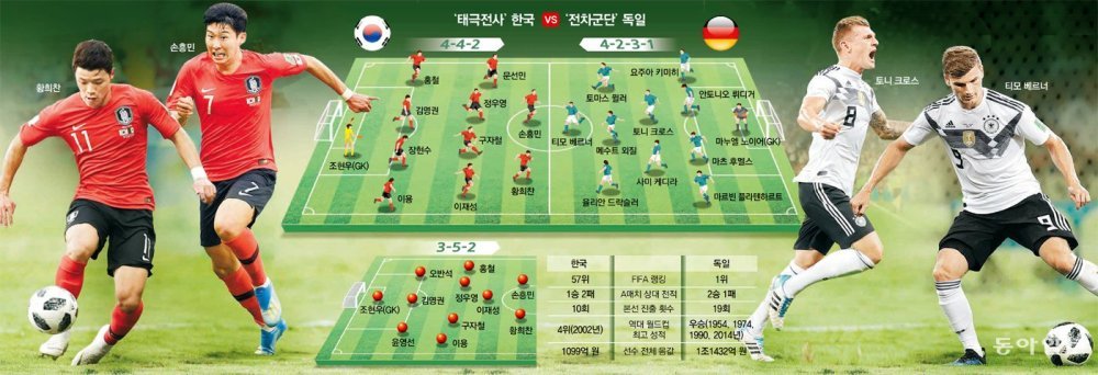 曾在德甲联赛汉堡(2010 ~ 2013年)、勒沃库森(2013 ~ 2015年,以1军为标准)效力多年的孙兴慜非常清楚德国防守队员的特点。孙兴慜在与墨西哥队的比赛中,凭借梦幻般的远射成功破门得分,并找回了进球感觉。他信誓旦旦地表示:“我没有别的话要说了。只能豁出去了。”黄喜灿在与墨西哥队的比赛中,表现出了边路快速突破的能力。但在与守门员一对一的情况下,没有射门而是选择传球,反而失去了进球机会。黄喜灿说:“一想到与墨西哥一战中的失误,就会觉得很可惜,甚至有点生气。很想在与德国的比赛中进球。”