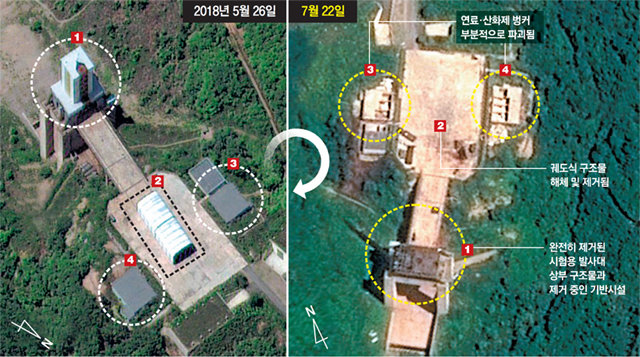 两天后的22日,从卫星照片上可以确认,其中一个建筑物的边角部分已被完全拆除,被解体的构造物被放在地面上。覆盖着发动机试验场的遮盖物也被揭开。但据“北韩38度”透露,燃料、氧化剂、地下掩体、主处理设施以及发射塔还没有被拆除。制作该报告的研究员约瑟夫·伯姆德斯分析说:“拆除作业大约是从两周前开始的。”